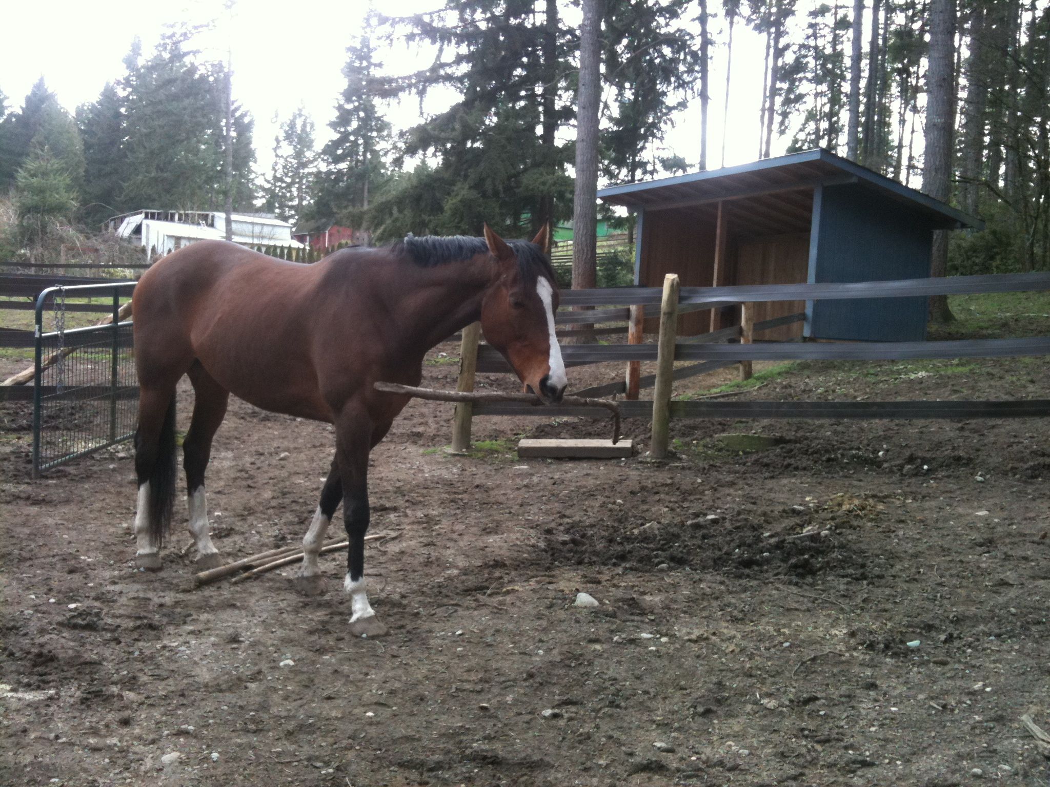 Do you know the Big Baby? His name is Chance and he is tall and young; in other words, a big baby. He is a horse called a Thoroughbred and like many Thoroughbreds, he is too curious for his own good. If there is a thing that the Big Baby can get into, you can be sure he will get into it. He loves to play with sticks and splash in the water, and he makes Mom laugh and laugh.