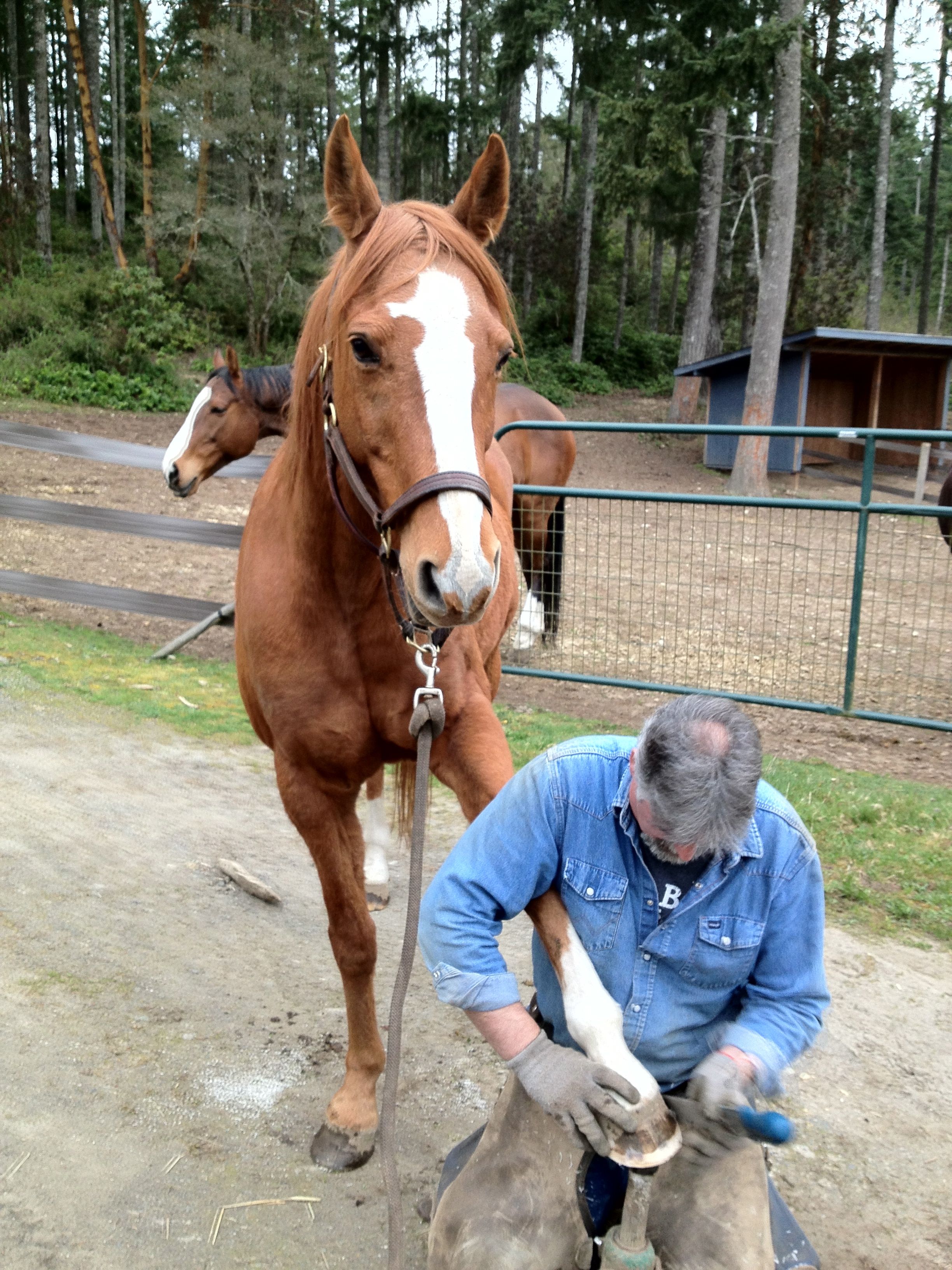Today the man who scrapes my feet came again. Usually he scrapes my feet in the barn aisle, but the barn aisle is still full of hays, so there is no room for foot scraping. So we did the foot scraping out in the driveway instead.